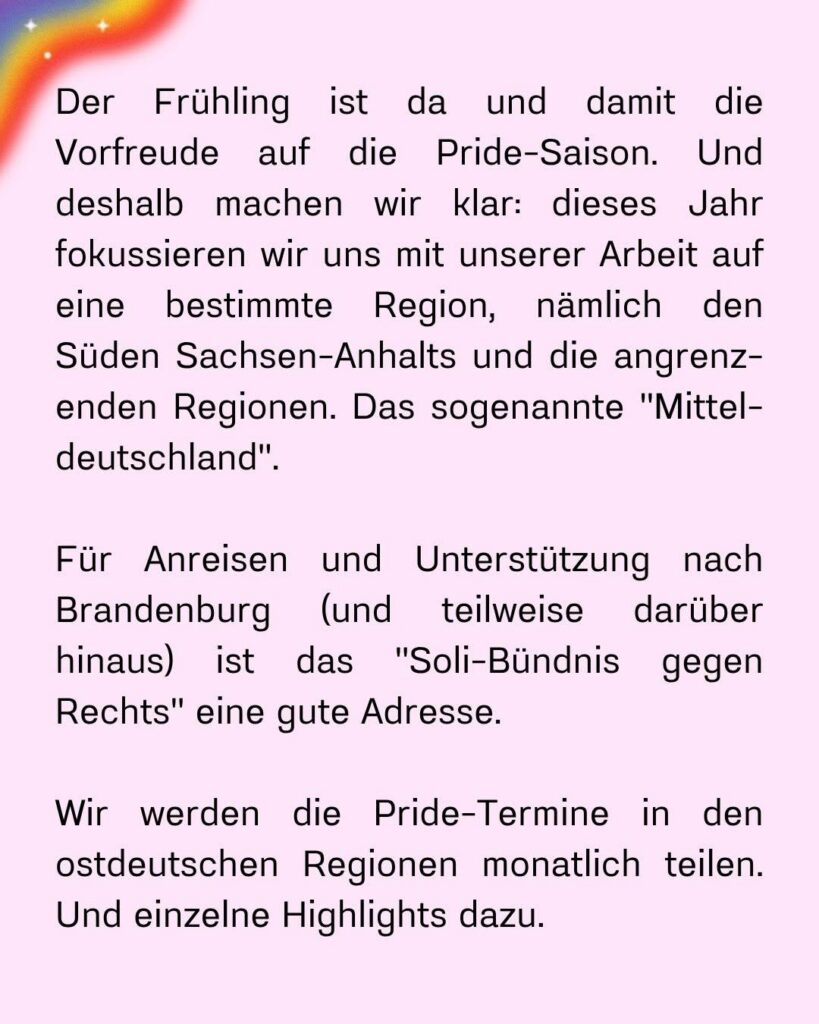 Der Frühling ist da und damit die Vorfreude auf die Pride-Saison. Und deshalb machen wir klar: dieses Jahr fokussieren wir uns mit unserer Arbeit auf eine bestimmte Region, nämlich den Süden Sachsen-Anhalts und die angrenzenden Regionen. Das sogenannte „Mitteldeutschland“.
