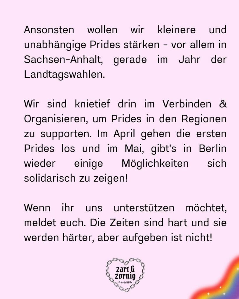 Ansonsten wollen wir kleinere und unabhängige Prides stärken – vor allem in Sachsen-Anhalt, gerade im Jahr der Landtagswahlen.